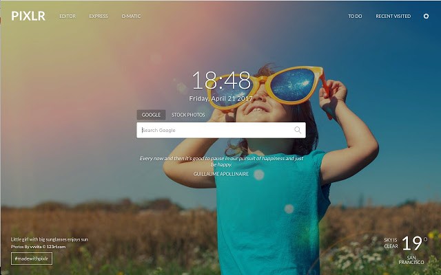 Pixlr가 만든 새 탭 앱입니다. 모두 아시겠지만 사진을 바꾸거나 탐색하는데 좋고, 메모같은 기본적인 기능도 있습니다. 눈에 띄는 점은 STOCK PHOTOS를 검색할 수 있네요. Pixlr가 자신들의 강점을 살려 특별한 재미를 추가했다면 사용자가 10배는 늘지 않을까 싶습니다.
