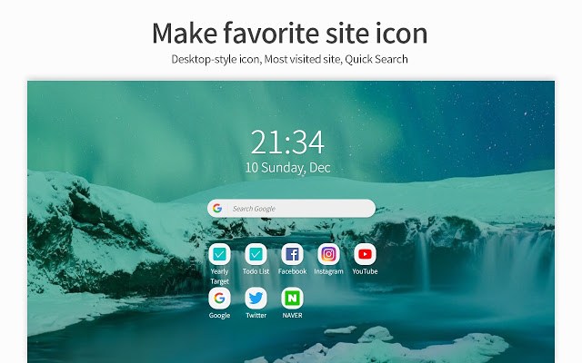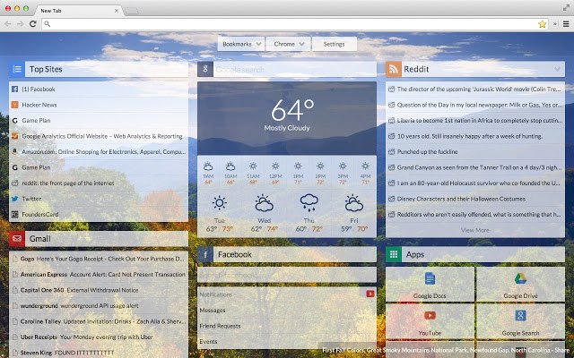 개인적으론 가장 멋진 새 탭 앱이라 생각합니다. 구글 어스에서 큐레이팅한 수 천장의 사진 중 랜덤하게 나타나는데 매번 엄청나게 놀라운 지구의 모습을 보여줍니다. 그 어떤 사진보다 순수한 자연 그자체에 압도당하는 느낌이 들 정도입니다. 구글 어스 뷰는 홈페이지도 매우 재미있는데, 가끔씩 멋지고 신기한 지구 사진을 보고 싶을 때 딱 좋습니다. 아쉬운 점이라면 단순히 보고 사진을 바꾸기만 하기 때문에 편리한 다른 기능을 바라는 분들에겐 부족하게 느껴집니다.