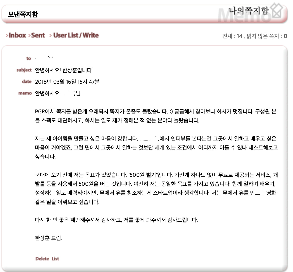 였다. 그 메시지 기록은 여전히 당시 대화했던 메신저에 고스란히 저장되어 있다. 나는 27살에 국내 모든 사람들이 다 아는 IT 대기업에서 연봉 1억 원을 받지 않고 에어데스크로 500원을 벌겠다고 했었던 개같이 미친놈이다. 나는 이런 수준의 미친놈을 대한민국에서 본 적이 없다. 내가 택한 운명은 그런 것이었다. 성공해보고 싶었다. 내가 믿는 제품을 과연 성공시킬 수 있을까.