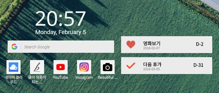 여러가지 추가된 사항이 있습니다. 배경화면은 기존의 무작위 배경에서 화질을 선택할 수 있게 수정했습니다. 또한 그라디언트 배경화면 추가했습니다. 현재 시간 및 검색바의 색 변경을 제공합니다.