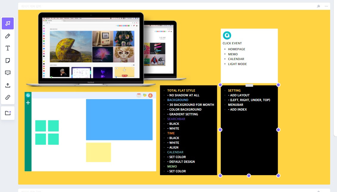 보시면 아래의 레이아웃 모양을 다양한 색의 메모를 이용해서 간단하게 잡아볼 수 있습니다. 또한 비캔버스 메모는 텍스트를 적고, 다양한 색과 폰트를 사용할 수 있는 것도 좋습니다. 사이즈 조절과 자석처럼 붙는 기능도 편리합니다. 모든 면에서 따라할 점이 많은데 에어데스크에서도 이런 편리한 메모를 제공해드리고 싶습니다. 그렇게 되면 메모만 가지고도 정말 쓸 곳이 많지 않을까 생각하고 있습니다.