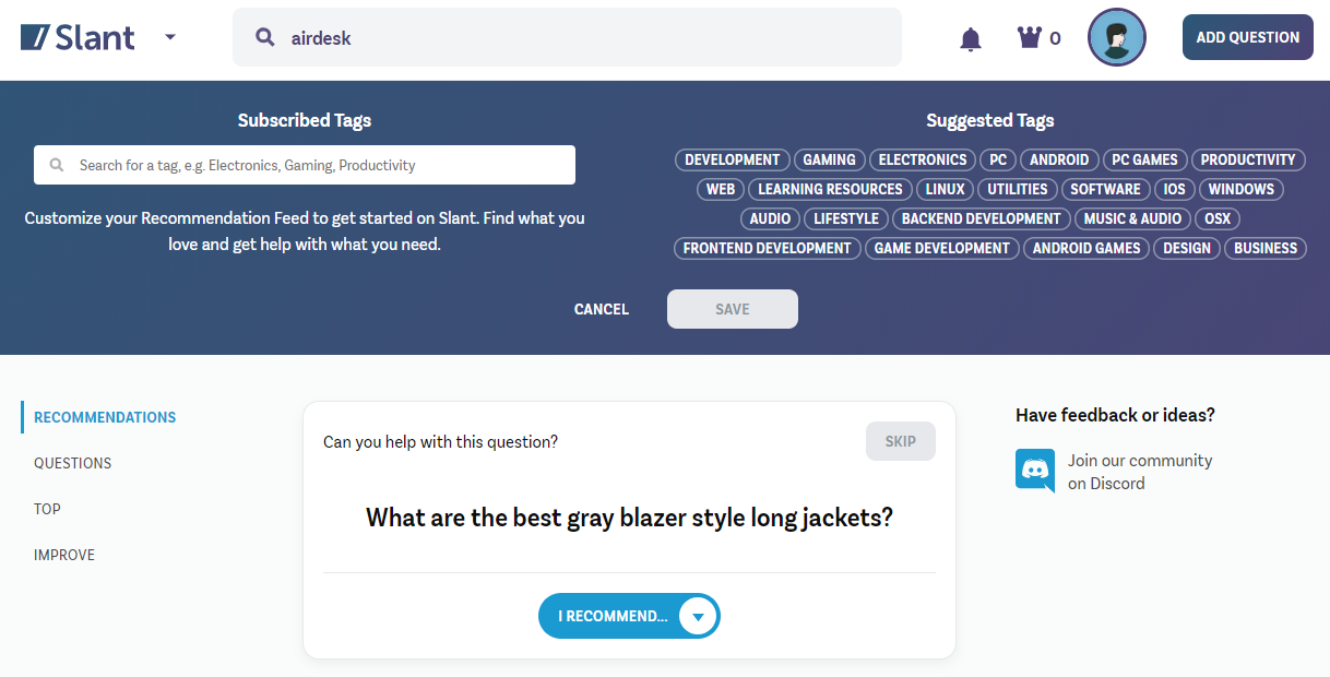 Slant는 다양한 서비스를 소개하는 웹서비스입니다. 카테고리별로 분류도 되어있고, 지속적으로 뉴스레터를 통해 회원들의 참여 및 신 제품 소개, 큐레이팅된 제품 소개 등을 하고 있습니다. 특별한 강점이라면 해당 카테고리의 랭킹을 확인할 수 있다는 점입니다. 다만 Slant의 사용자가 많지 않아서 순위가 큰 의미를 지니지 않고, 어뷰징도 많이 하는 것으로 보입니다.