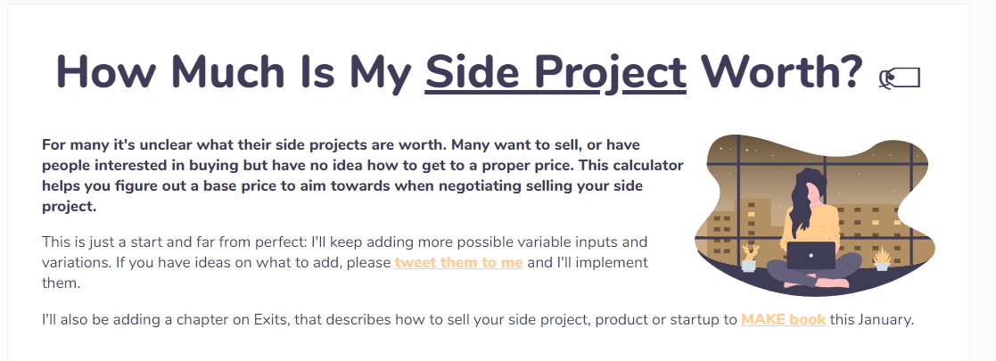 How mush is My Side Project? 는 여러분의 프로젝트의 가치를 평가해줍니다. 연 매출, 비용을 작성하고, 한 주에 사용하는 시간을 적으면 됩니다. 그 밖의 세부적인 값을 조정하면서 프로젝트의 가치를 확인할 수 있고, 예상되는 성장 폭도 확인해볼 수 있습니다. 저희 에어데스크의 경우 현 시점의 매출을 기준으로 하니 -5만달러의 가치가 있더군요;;