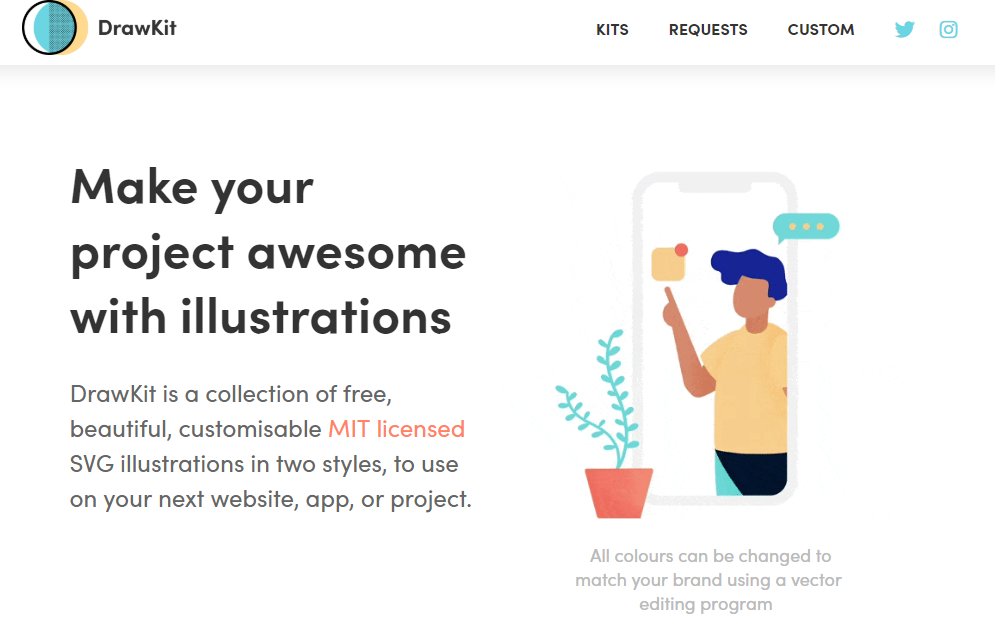 비슷한 예로 DrawKit라는 서비스도 있습니다. 많은 서비스들이 이곳의 이미지를 사용하고 있습니다. 이 서비스 역시 일러스트레이션을 무료로 제공하지만 무료로 제공되는 폭이 좁아서 왠만하면 유료로 구매해서 사용해야할 것 같습니다. 또한 홈페이지가 오류가 많은 것 같은데, 제대로 동작이 안되는 현상이 자주 생기곤 합니다.