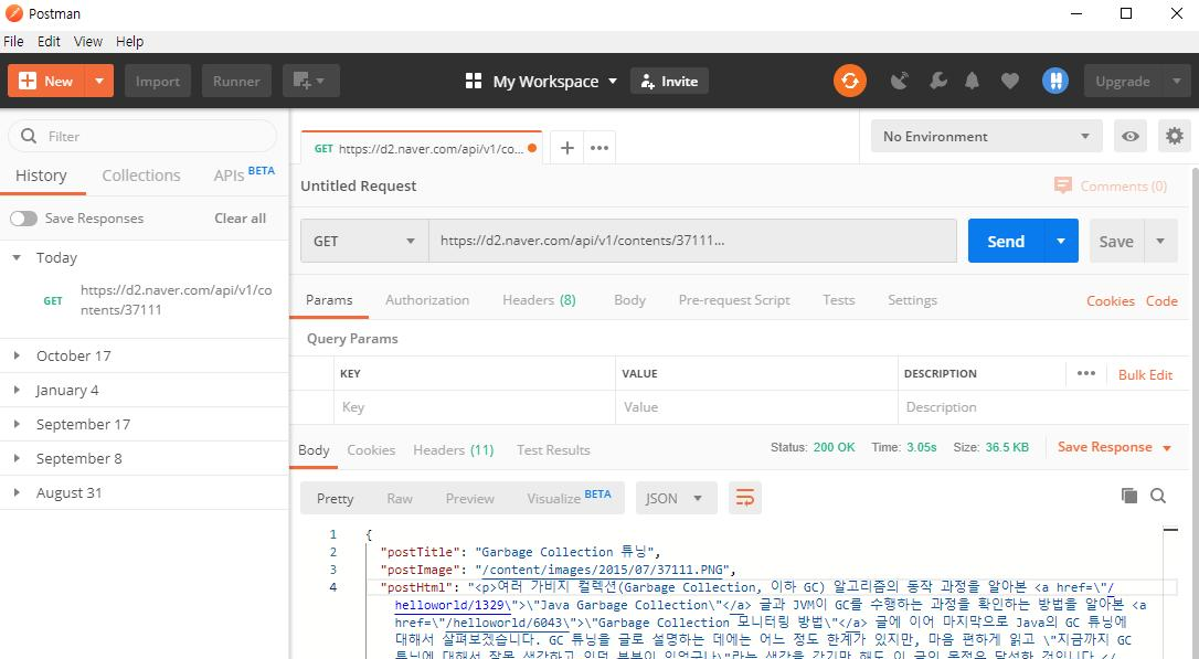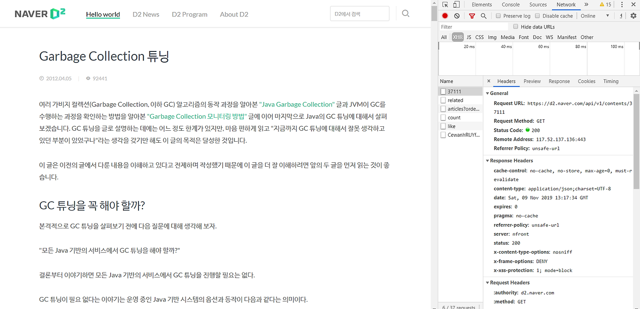 개발자 도구 네트워크 탭에서 데이터 가져오는 부분을 찾아봅니다. GET 요청이 보이네요. 제가 원하는 요청입니다. 이걸 저도 요청할 수 있을지 Postman을 이용해 확인해봅니다.