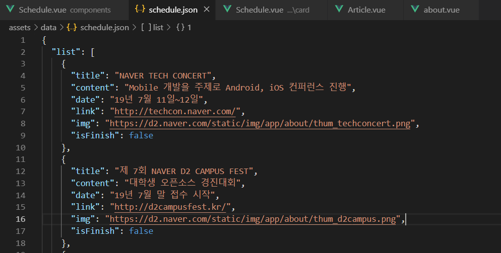 schedule.json 파일을 만들어서 데이터를 만들어봤습니다. 날짜부분은 두 줄을 표시하는게 귀찮으므로 v-html을 통해서 가져오도록 합니다.(다들 아시겠지만 v-html은 XSS 공격 위험 때문에 사용을 자제하거나 sanitize해서 사용해야 합니다.)