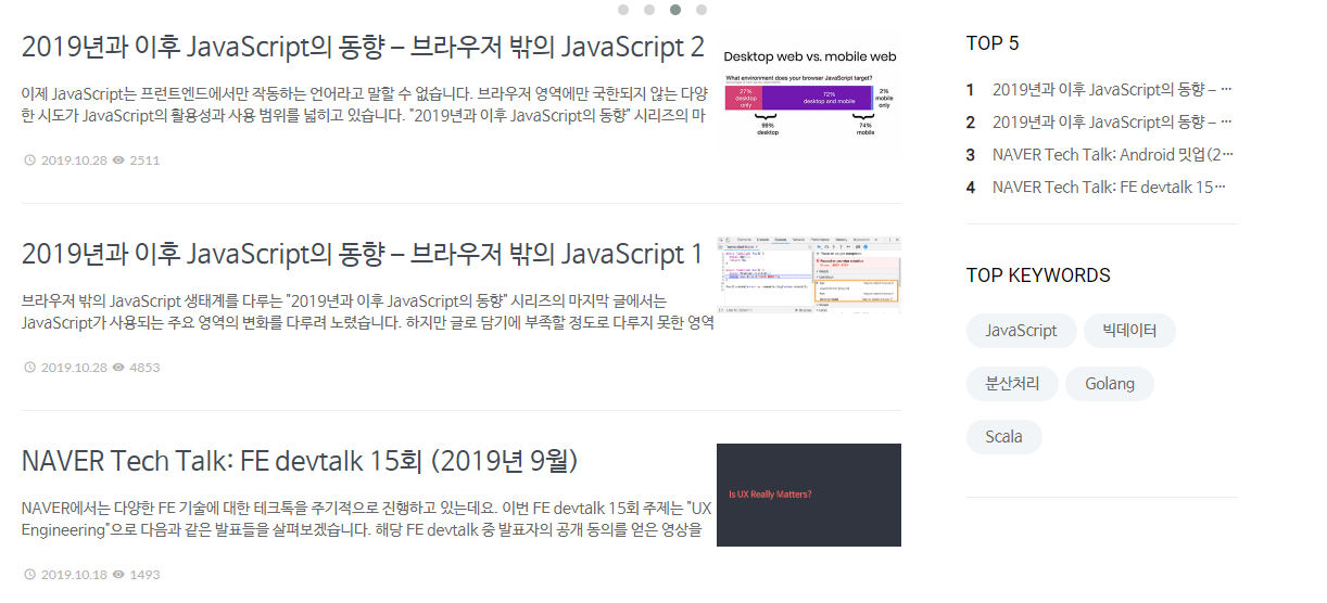 두번째 방법인 GET 요청을 하지 않고 몇 개만 제가 긁어서 샘플로 만들어 게시판을 구현해보겠습니다. 귀찮으니 각 게시판별로 2개의 글의 서두 및 제목, 메타데이터, 썸네일 정도만 가져왔습니다. 그리고 2개의 글을 위해 페이지네이션을 구현했습니다. 각 페이지에는 1개의 게시글이 나타납니다.