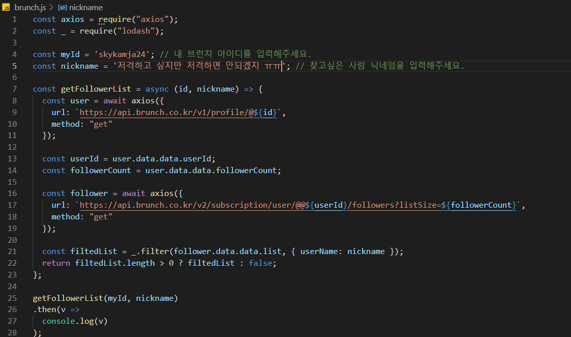 그럼 이제 준비는 끝났다. 브런치 아이디(프로필 주소 마지막 부분)만 알면 구독자 전체를 리스트로 획득하고, 특정 사람이 나를 구독하는지 찾아볼 수 있는 코드를 작성할 준비를 마쳤다.