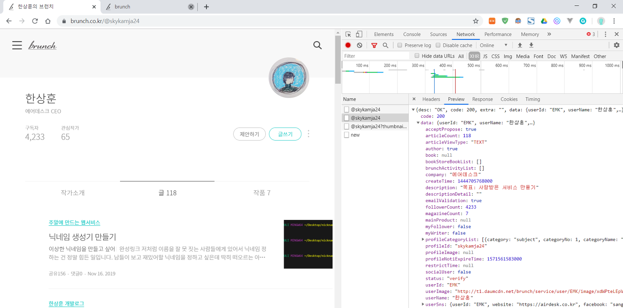 이 시점에서 URL을 조금만 수정해도 내가 원하는 데이터는 모두 획득할 수 있었다. 하지만 나는 좀 더 보편적인 상황에 대처하고 싶었다. 이미지를 자세히보면 유저 아이디가 내 아이디와 다르다. 내 브런치 아이디는 skykamja24(하늘감자24)인데 주소에 나타난 아이디는 EMK이다. 어디서 온 값일까?