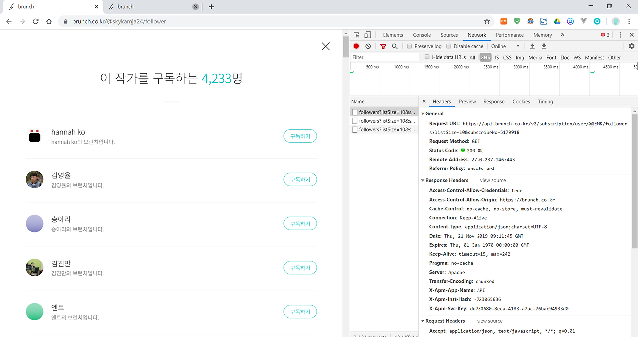 get 요청을 분석해보면 user/@@유저아이디/followers?listSize=리스트크기 형태로 가져오는걸 확인할 수 있다. 이 요청을 누구나 다 할 수 있는걸까? 브런치는 따로 요청을 제한하는게 없는 것으로 보인다. Postman을 통해 동일한 URL로 요청을 쏘면 동일한 결과를 얻을 수 있었다.