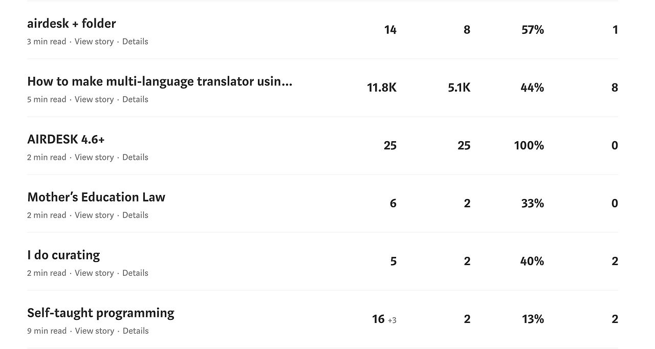 브런치가 처음 시작하는 작가님들에게도 기회를 주고, 좋은 글을 발견하는 곳이라면 미디엄은 정반대다. 내 글의 조회수를 보면 확연히 나타난다. 에어데스크의 업데이트 정보를 담은 글들은 올린 지 몇 년이 지났는데 10번도 안 읽힌 글이 있다. 반면 사람들에게 도움이 될만한 글이 있다면 해당 글의 조회수는 1000배 이상의 조회수도 거뜬하다. 이런 의미에서 영어로 쓴 글 + 사랑들이 많이 검색할만한 글 위주로 작성하는 게 미디엄의 성공 문법이라 생각한다.