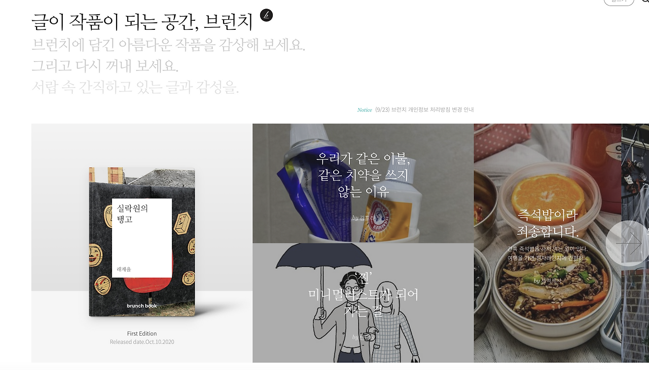 반면 브런치는 글을 처음 쓰는 작가들에게 호의적이다. 브런치 메인에 추천된 글을 하나하나 읽어본 적 있는가? 생각보다 구독자가 적은 작가님들의 글이 많이 올라온다는 걸 발견할 수 있다. 아마도 브런치의 수많은 에디터님들이 직접 콘텐츠를 읽어보고 하나하나 고른 게 아닐까 싶을 정도로 모래 속 진주 같은 글들이 올라온다.