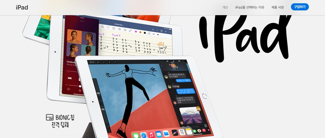 애플의 아이패드 소개 페이지입니다. GNB가 불투명하게 처리된 것을 볼 수 있습니다.