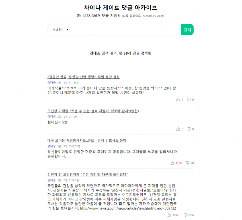 댓글이 130만 개 수집됐을 때 댓글 아카이브를 만들어 모두가 쉽게 확인할 수 있고, 여론 조작의 중심축으로 의심받는 사람들을 검색할 수 있도록 했다.