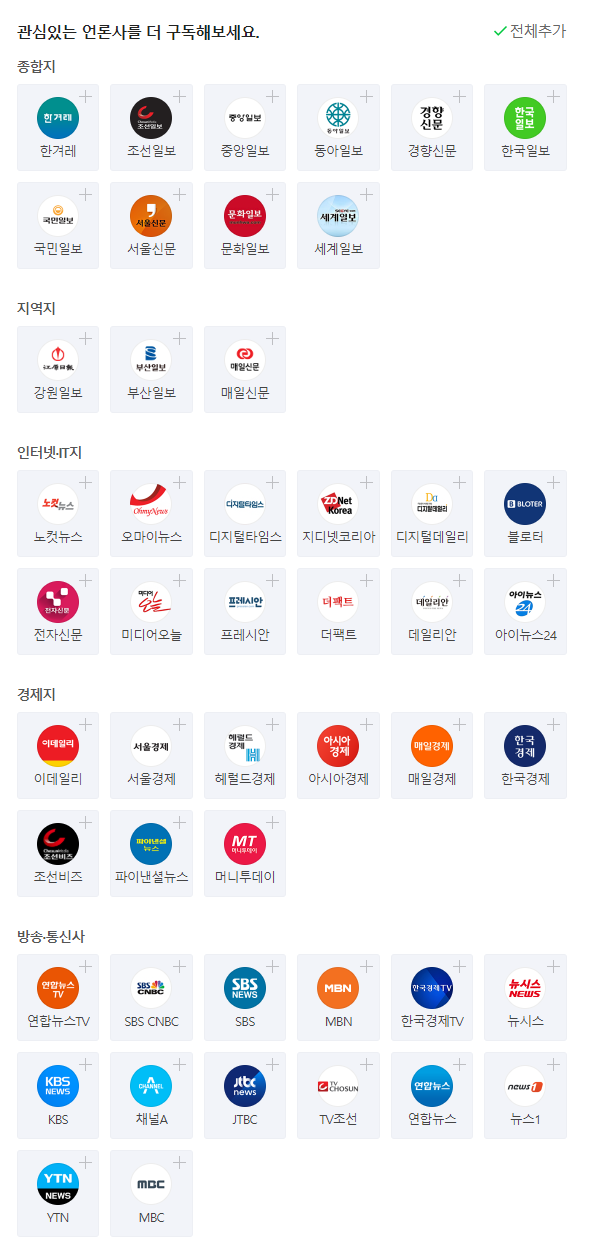 위의 목록은 네이버 뉴스에 콘텐츠를 올릴 수 있는 48개의 언론사다. 이들을 하나하나 들어가 각 사이트의 robots.txt 파일을 조회하면 크롤링 정책을 확인할 수 있다. 이들 중 크롤링을 허용한 언론사에 한하여 데이터를 수집했다.