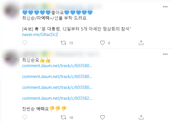 이를 쉽게 발견할 수 있는 곳은 트위터였다. 트위터에서는 아직도 "역따"와 같은 말로 여론 조작을 대놓고 권하는 이들을 쉽게 발견할 수 있다. "역따"를 모르는 이들을 위해 설명하자면 "역따"라는 말을 쓰고 밑에 링크를 몇 개 넣는다. 해당 트윗을 보는 팔로워들은 "역따" 아래 달린 링크에 들어가 정치성향에 반대하는 댓글을 찾아 싫어요를 누른다. 이렇게 대놓고 여론 조작을 하는 이들이 오늘, 지금도 존재한다.