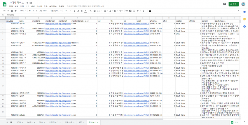 조사가 점점 커지면서 나는 많은 정보를 얻을 수 있었다. 3월 2일부터 시작한 조사는 불과 2주 만에 한국 전체의 댓글 흐름과 하루 평균 댓글의 개수를 예상할 수 있을 만큼 정교해졌다. 구글 스프레드 시트에 정보를 공개하는 것도 불가능해졌다. 이유는 구글 스프레드시트의 셀은 무한대로 허용되지 않는다. 댓글이 100만 개를 넘어가면서 스프레드시트로를 관리할 수 없게 됐다.