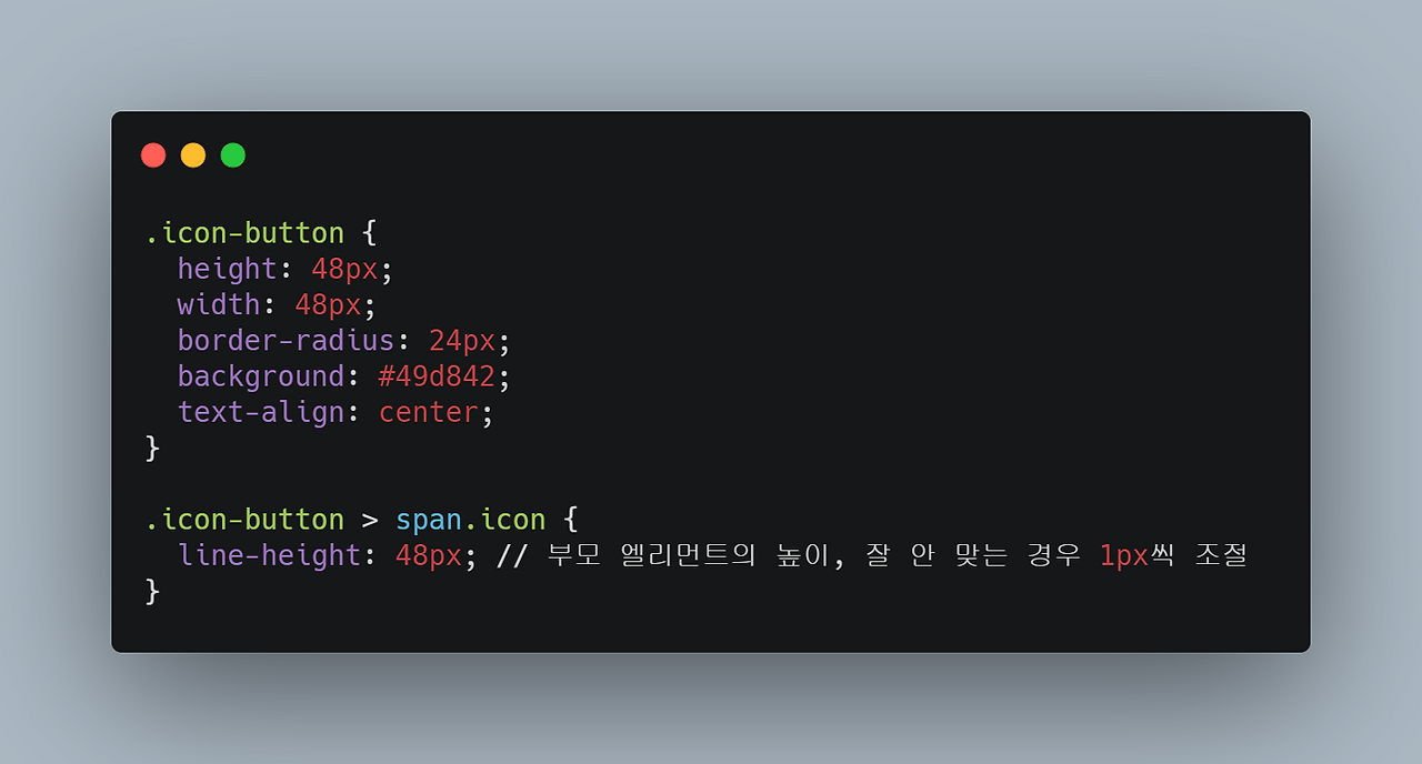 fontawesome과 같은 폰트 기반의 아이콘을 중앙에 위치시켜야 할 때 간단하게 쓸 수 있는 방법입니다. 아이콘을 <span>으로 감싼 후 line-height 값을 직접 입력해 넣어줍니다. 보통은 부모 엘리먼트의 높이를 그대로 입력하면 중앙에 오게 할 수 있는데, 폰트 기반 아이콘의 경우 값을 정확히 입력했을 때 묘하게 중앙이 안 맞는 경우가 있습니다. 이때 line-height를 1px씩 조절해 맞춰주면 됩니다.