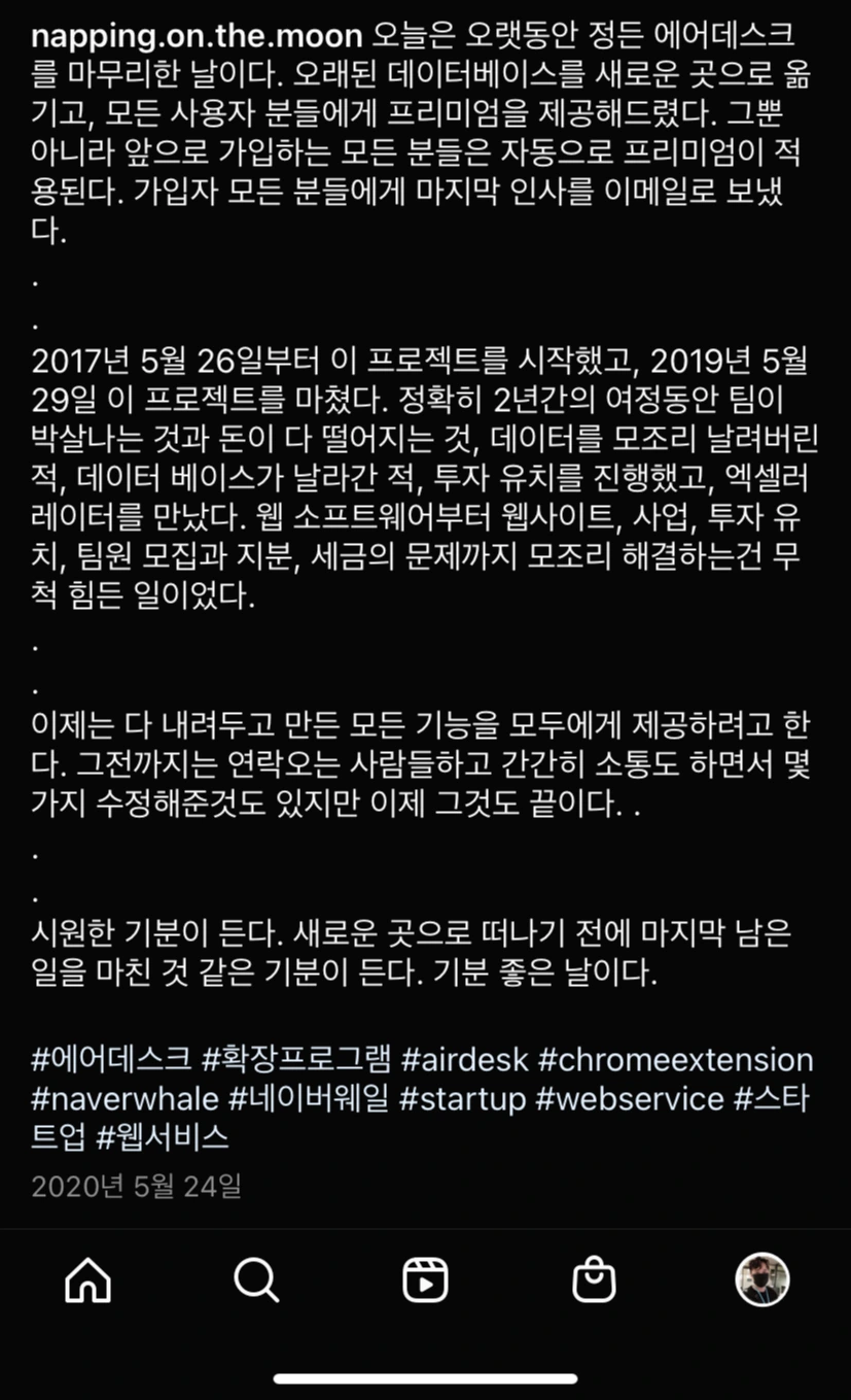 이렇게 에어데스크 개발을 중단하고 나서 나는 스타트업 팀에 합류했다. 기존에 유료로 제공되던 기능도 모두 무료로 풀었다. 어차피 내가 쓰기 위해 만들었으니 돈이 더 들어가는 것도 아니었다. 그래서 모두에게 무료로 모든 기능을 풀었다.(에어데스크는 지금까지도 프리미엄이 무료다. 회원가입만 하고 로그인하면 적용된다.)