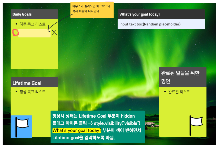 한 3번째쯤 정한 레이아웃 구조입니다. 좌우에 플래그 이미지는 버튼을 의미하고, 나머지 네모 상자들은 적당한 위치를 잡는 용도입니다. 위에 보면 간단한 애니메이션 효과, 인풋 텍스트의 플레이스홀더를 랜덤으로 정해주자는 아이디어도 적어보았습니다.