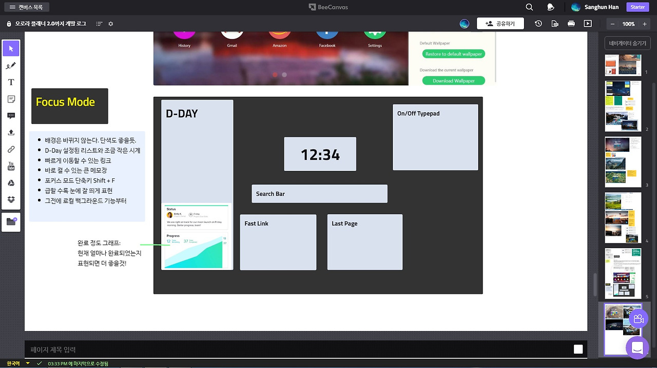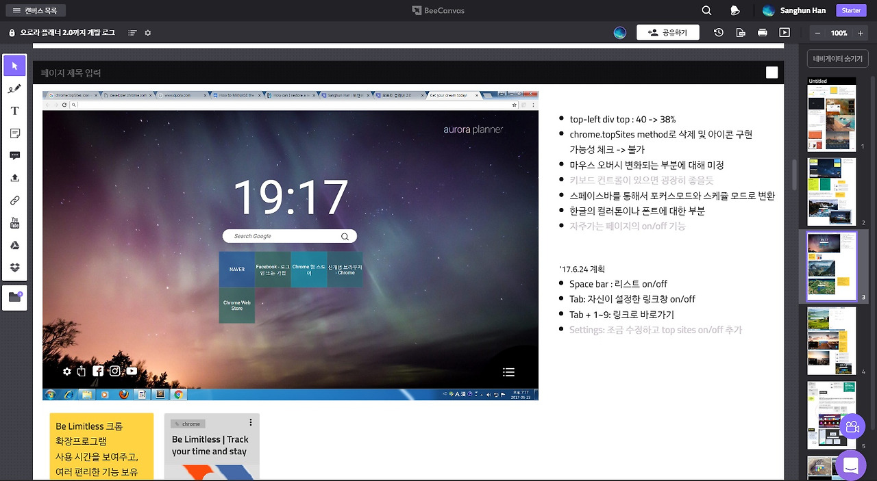 항상 사용하는 '비캔버스' 를 활용해서 아이디어 노트를 작성했습니다. 이번 업데이트에서 중요하게 생각한 부분은 드래그, 자주 가는 페이지, 마우스 오버, 숏컷, 검색 제공자 변경이었습니다. 그 중에서 가장 최근에 업데이트한 내용부터 설명해보겠습니다.