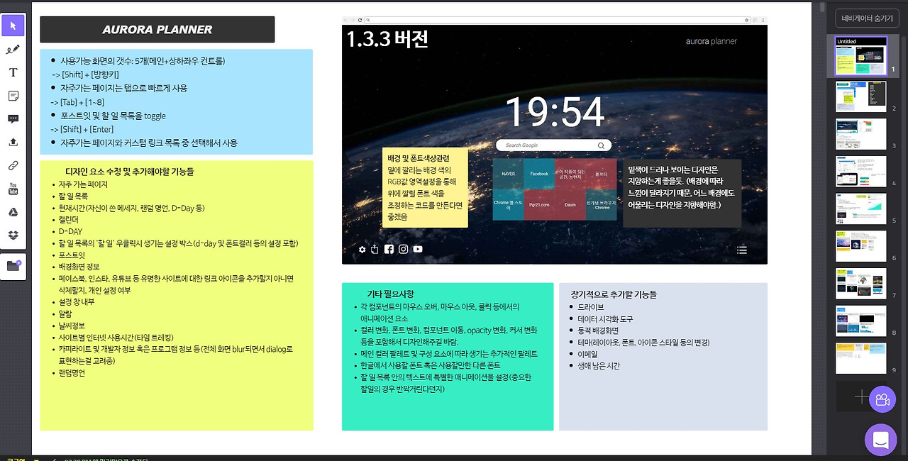 아직까지 작성된 기획 및 아이디어 정리 등에 사용된 실제 노트는 3권과 약 80여장의 캔버스입니다. 현재 주간 사용자는 500명, 웨일과 크롬에서 제공되고 있습니다. 구성하고 있는 코드는 2724줄, 사용된 시간은 개발 160시간 이외 계획 및 아이디어, 디자인 등을 합해 400시간 가량입니다.