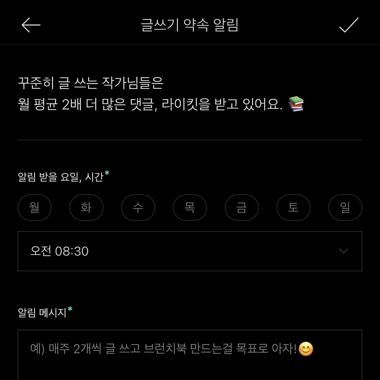 알림을 끄는 게 불가능한 알림이다. UX 원칙에서 사용자에게 자율권을 주라는 것을 완전히 무시하고 알림을 받으려면 글쓰기 약속 알림을 설정해야만 한다. 당연히 나는 글쓰기 약속 알림을 받고 글 쓰고 싶지도 않기에 알림을 꺼야 하는데 그러면 모든 알림을 다 꺼야 한다.