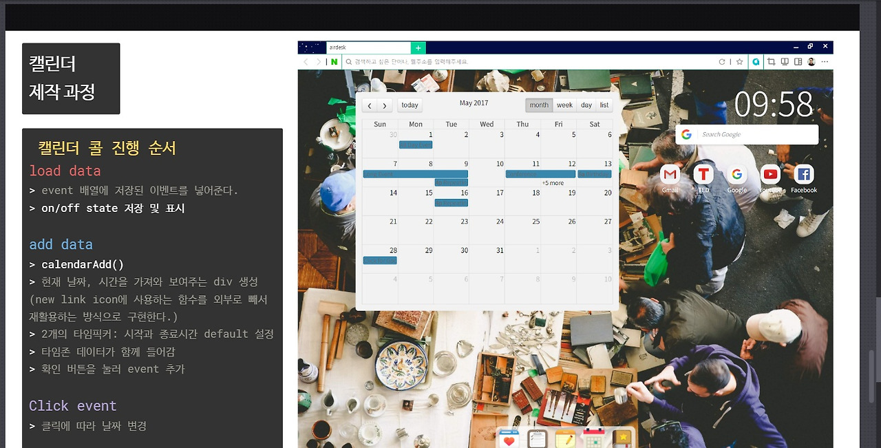 에어데스크는 새 탭을 바꿔주는 브라우저 확장 프로그램입니다. 이번 휴가때는 뭘 만들어볼까 하다가 캘린더를 만들었습니다. 사실 만들었다기 보단 다른 사람이 만들걸 가져와 쓴 것입니다. 바로 오픈소스를 활용했는데 가장 대표적으로 쓰이는 캘린더 소스인 fullcalendar입니다.