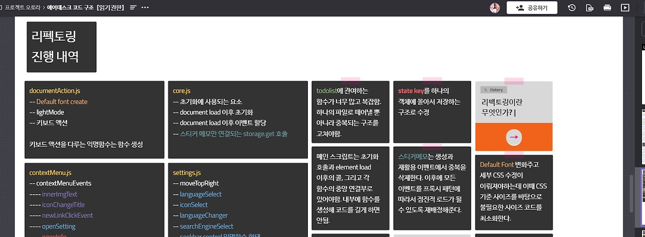 요즘에 개발되는 속도가 상당히 줄었는데, 2~3주에 걸쳐서 리팩토링을 진행했습니다. 완벽한건 아니지만 전역변수도 상당히 줄이고, 중복코드를 줄였습니다. 제 의견으로는 js 프로그래밍을 하다보니 하나의 파일이 하나의 기능을 전담하는 구조가 이상적인 것 같습니다.