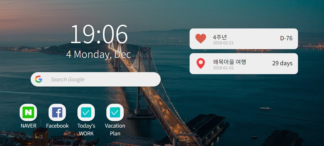 목표를 적어둘 때 며칠 남았는지 보면 편리합니다. 스마트폰에선 흔히 있는 디데이 기능을 컴퓨터로는 쉽게 확인하기 어려웠습니다. 그래선지 오로라 플래너 시절부터 디데이를 멋지게 보여주는건 오랜 목표였습니다. 몇 주간의 개발로 간단한 스타일의 디데이를 만들어봤습니다.