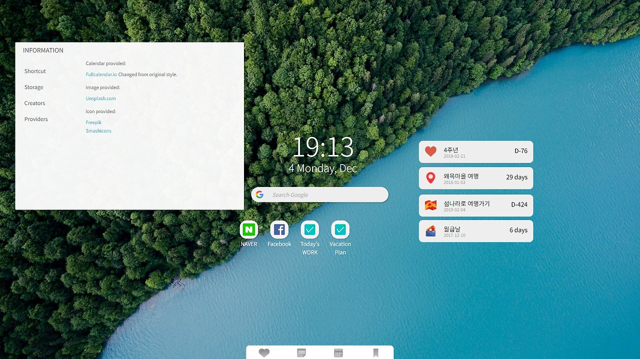 마우스 우클릭을 통해서 만들 수 있고, 수정도 가능합니다. 6개의 아이콘을 선택해서 원하는 위젯 형태로 바탕에 추가할 수 있습니다.