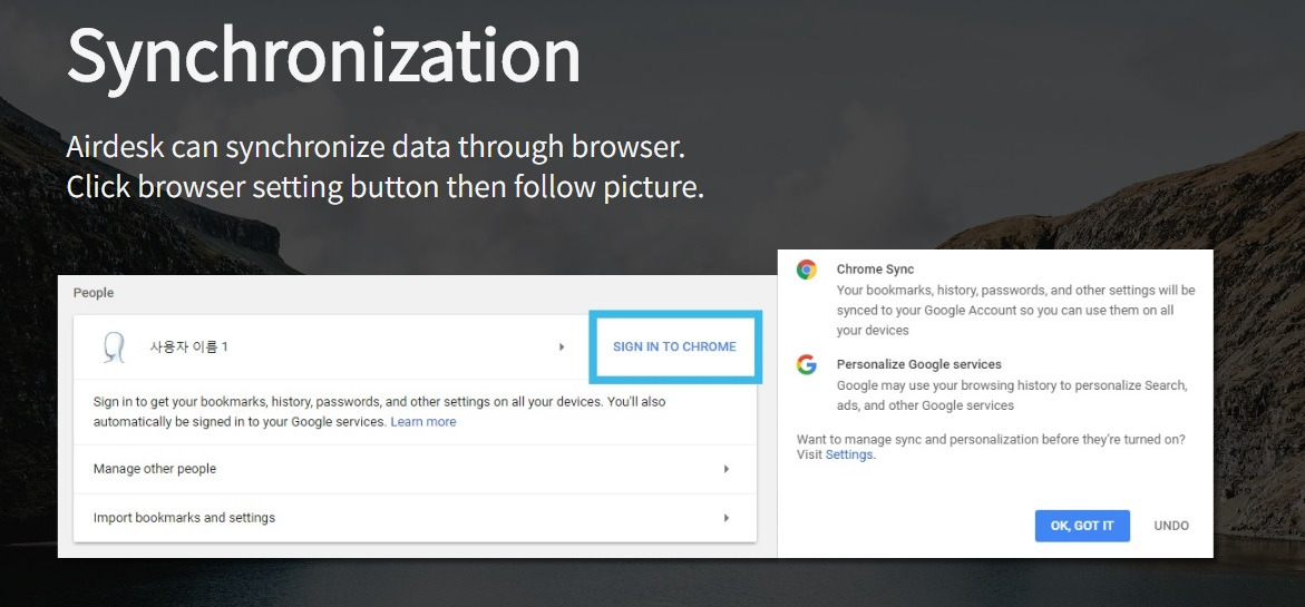 마지막으로 동기화 기능입니다. 글에서는 자주 설명했으나 동기화 기능을 아시는 분이 거의 없는듯 합니다. 동기화를 해두시면 에어데스크를 사용하시는 곳 어디서든 동일한 화면을 보실 수 있습니다.