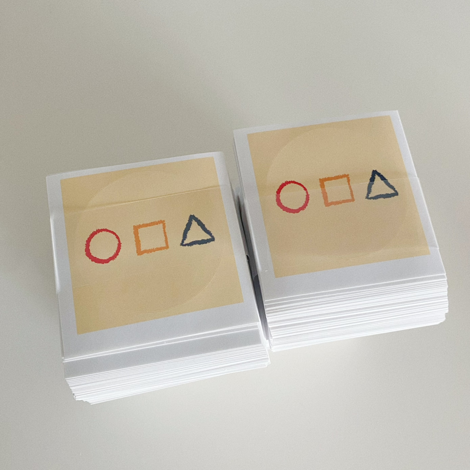 결혼을 하고 베이킹에 취미를 들였다. 제과기능사 자격증을 따고선 남에게 선물할 자신감도 조금 생겼다. 친지나 친구들과의 만남에 구움 과자를 선물할 일이 잦아졌다. 평소 과대포장은 지양하는 나이지만 음식에만은 보기도 좋은 떡이 먹기도 좋다는 속담을 따른다. 빵이나 케이크를 누군가에게 나눠줄 때에는 포장하는 재미도 쏠쏠한데, 결국 과대포장이 싫기 때문에 반투명 봉투에 스티커 또는 크라프트 봉투에 스티커 조합으로 포장하기를 선호한다. 처음에는 Hand-made나 Home-made라고 쓰인 스티커를 사서 붙이다가 재작년에 나만의 스티커를 만들어 붙이고 싶어졌다. 서예가가 일필휘지 하고 인장을 찍는 것처럼. 어떤 모양으로 만들어야 나를 나타내는 나만의 스티커가 될 수 있을까 고민했다. 궁극에는 어렸을 적부터 나의 정체성으로 삼아온 도형 세 개를 떠올릴 수밖에 없었다. 동그라미, 네모, 세모, 가장 기본적인 도형. 그리고 빨강, 노랑, 파랑, 가장 기본적인 색을 쓰고 싶었다. 포토샵 일러스트레이터 체험판을 내려받고 일주일의 무료 기간이 끝나기 전에 근본 없는 실력으로 이미지 제작에 몰두했다. 인터넷을 뒤져 무료로 저장해 쓸 수 있는 크레파스 질감의 브러시를 찾았다. 삼원색을 활용해 동그라미, 네모, 세모를 같은 크기로 그렸다. 이미지를 완성했으면 스티커 제작사에 주문을 의뢰하는데, 최소 단위는 500매, 나는 호기롭게 1000매를 주문했다.