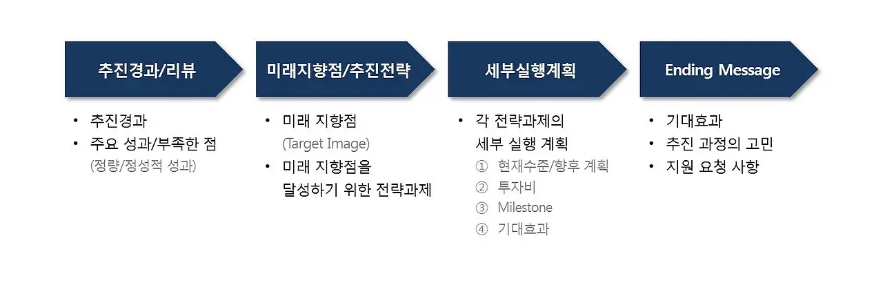 <추진경과/현황 리뷰> 결과와 연결하여 앞으로 회사가 어떤 모습이 되고 싶은지를 정의하여야 한다. 그동안 추진해온 과제를 향후 어떻게 전개할 것인지, 새롭게 추가되거나 변경된 사업 아이템은 어떤 것들이 있는지를 설명해야 한다.