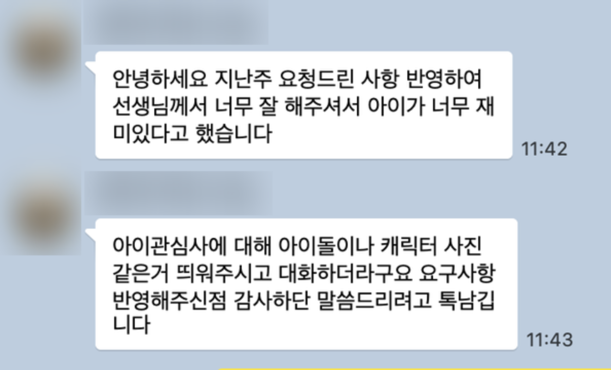 며칠 전, 수업을 듣는 학부모님께 감사 인사 메시지를 받았어요.