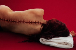 분화되고 꿰매었습니다. (등판 제왕절개)