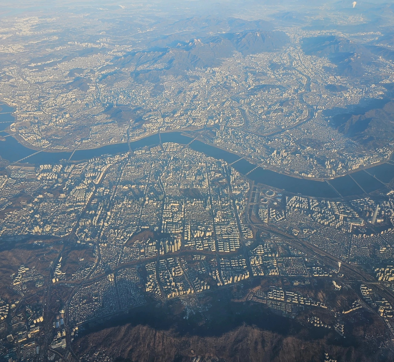 인천을 출발하는 가나자와 비행기는 한반도를 가로질러 서울, 강원도를 지나 동해를 건넌다 비행기에서 촬영한 서울 강남구 풍경