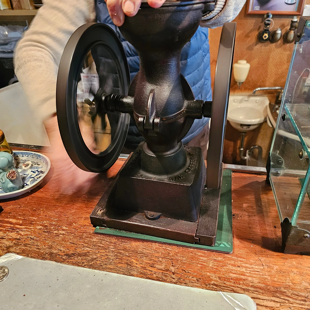 오래된 카페에서 노 사장이 직접 내려주는 드립커피를 마시며 유쾌한 대화를 하다 다이쇼 시대 제작한 100년 된 커피 그라인더 (스웨덴산 철/일본산 나무)로 갈아 내리는 원두커피는 맛있었다