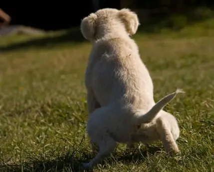길 가다 멈춰 볼일을 보고 있는 강아지의 자세가