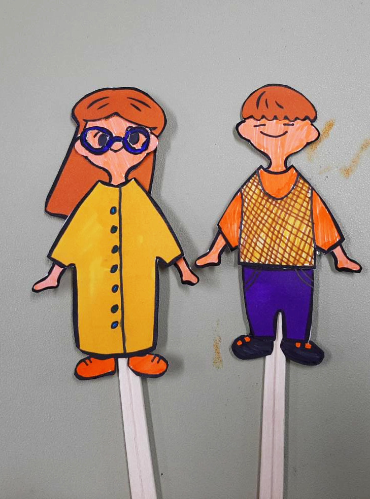 5. 나무 젓가락 고정하기: 종이 인형 뒤에 나무 젓가락을 테이프로 붙입니다.