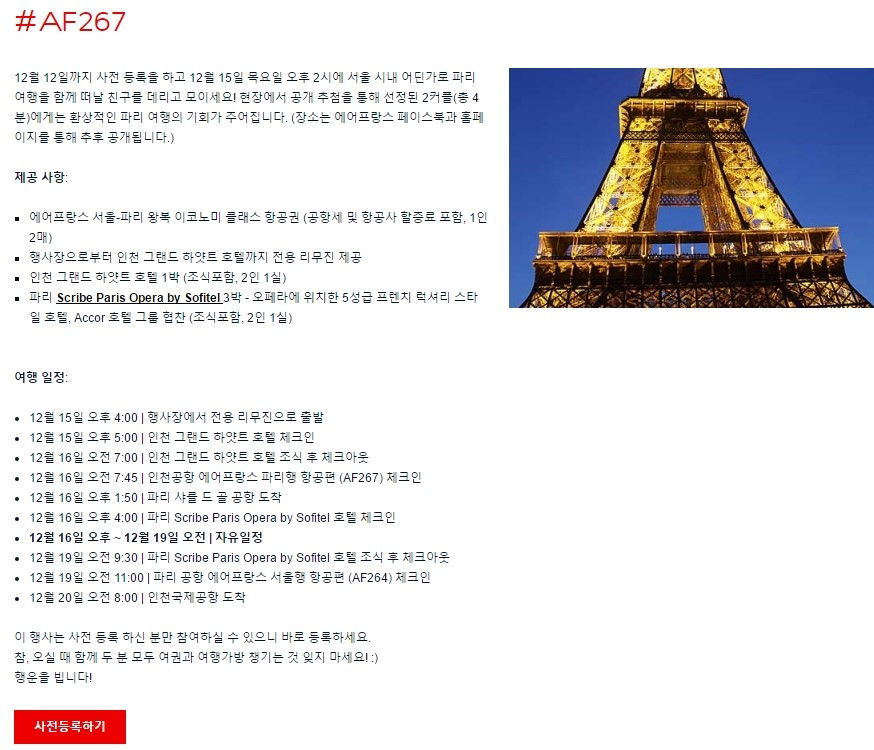 여행에 목마르던 내게 불씨를 피운 존재는 에어프랑스 항공사다. 재작년 겨울 에어프랑스는 동대문 디자인플라자(DDP) 어울림 광장에서 특별한 이벤트를 열었다. 사전 등록자 700 커플을 모아 놓고 딱 두 팀을 추첨해 바로 파리로 보내주는 내용이었다. 서울 서쪽 끝자락에 사는 나는 파리에 앞서 동대문까지 머나먼 여행을 떠나야 했다. 강추위가 제대로 닥친 날이었다. 신랑은 당연히 말렸다. 700분의 1의 확률을 뚫기는 하늘의 별따기라며 언젠가는 본인이 꼭 따로 보내주겠다고 공수표를 날렸다. 홍콩을 보내준다고 각서까지 써놓고 세 번이나 비행기를 취소했던 터라 신랑 말을 흘려 들어버렸다. 거침없던 나를 막을 자가 없었다. 이벤트 주인공이 나일 거라 굳게 믿었다.