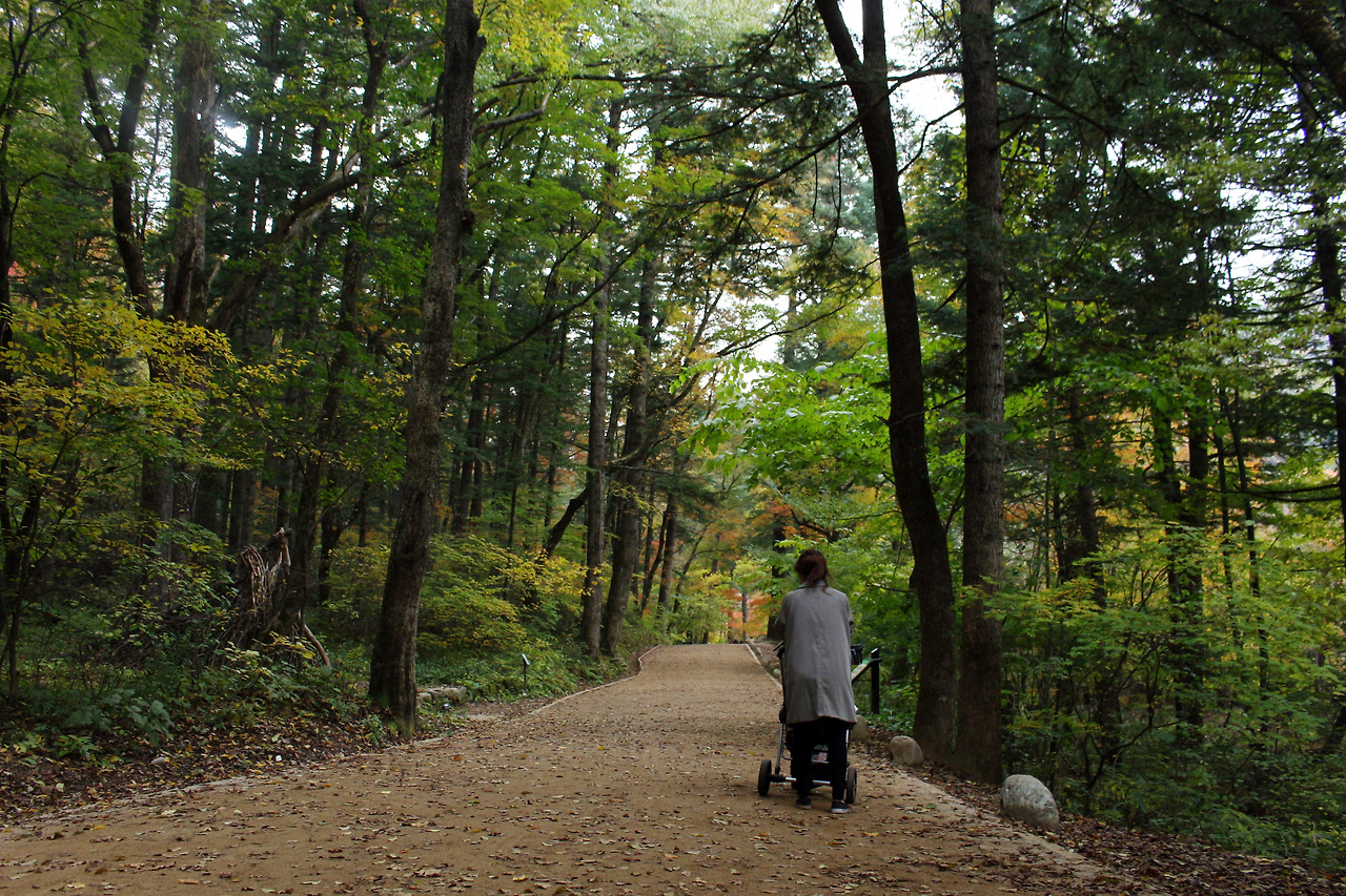 전나무숲에서 뛰어놀다 잠이 온 아이들을 유모차에 태우고 우린 각자 한참을 걸었다. 그 순간 대화할 의무가 없었다. 신랑을 두고 오면 이런 장점이 있었다. 신랑이 옆에 있어도 말을 걸지 않으면 괘씸할 테고 조잘조잘 말을 걸면 집에 있는 기분마저 들 테고, 아이를 맡기고 잠시 혼자 시간을 보내도 그 시간 만으론 성에 안 찰 거니깐. 지쳤던 마음을 서로 읽고 있었기에 두 엄마는 홀로 시간을 주고 싶었다. 그렇게 걸으며 지난 추억에 젖어 있을 때, 절 내 풍경이 눈앞에 펼쳐졌다. 당시 심정이 떠올라 눈시울이 붉어졌다. 잠에 빠져 있는 딸에게 말해주었다. "태린아 엄마에게 정말 소중한 곳이야." 법당에 계신 부처님이 보일 때는 얼굴이 일그러지면서 눈이 감겼다. 참아도 참아도 입까지 부르르 떨렸다. 그때 감정을 가슴이 기억하고 있었다.