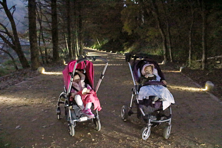 두 아이가 잠에서 깨더니 강아지 소리를 내며 장난칠 때, 점심공양 뒤 원주스님과 직원 분들, 커다랗던 개 '떡쇠와 멍울이'도 함께했던 산책길이 기억났다. 어둑한 시간엔 차마 엄두를 못 냈던 길. 깜깜해져도 조명이 생겼으니 전나무숲길을 다시 걸어보았다. 월정사에서 머물 때도 하지 못했던 저녁 산책이었다. 은은한 조명이 아래쪽에 있어서 특별한 분위기를 자아냈다. 우리는 나무들이 쉬는 시간을 방해하지 않으려고 더 조심히 걸었다. 조명 위치를 보고 준우 엄마는 모든 이곳 요소가 배려 덩어리라고 했다. 그래서 평창 여행이 더 감사했다고 했다.