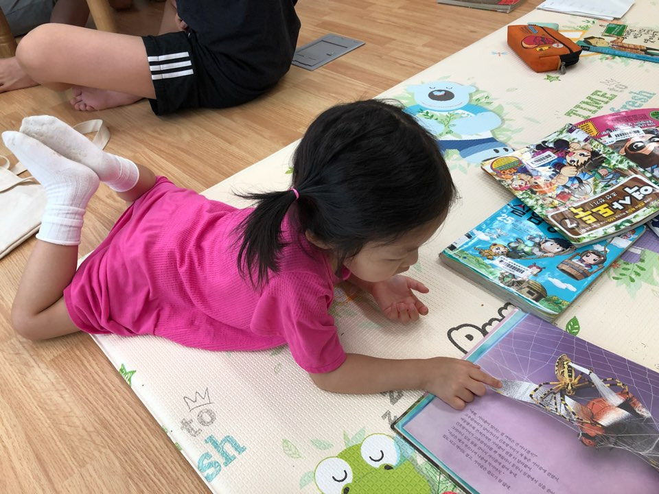 도서관에 다니다 보면 엄마가 굳이 관여하지 않아도 된다. 집에 있는 책을 다른 모녀가 읽고 있으면 태린이가 다가가 아주머니처럼 상관한다. 책을 꺼내 오다가 어떤 언니가 영어 챕터북을 읽는 모습을 보고 듣고 있기도 하다. 다른 엄마가 읽어주는 책에 귀를 기울이기도 한다. 옆에서 태린이가 말을 할 때 어떤 엄마나 아이는 중얼거리는 태린이 말을 받아준다. 내가 자주 다니는 도서관엔 이런 아이를 거부감 없이 받아들여 같이 책을 읽어주는 엄마들이 많다. 감사할 일이다. 아파트 도서관엔 몇 번 갔다가 가지 않게 됐다. 기증받은 좋은 책들이 많고 아이 친화적인 공간인데 몰상식한 엄마들 때문이었다. 하원한 아이들을 우르르 데려와서 마음껏 뛰게 했는데 아이들이 노는 것까진 괜찮다 쳐도 엄마들이 책을 읽어줄 마음이 없다는 게 문제였다. 태린이가 보던 책을 뺏어가도 못 본 척하고 엄마들끼리 수다 떨기 바빴다. 그런 일이 반복되다 보니 2킬로 정도 운전해서라도 공공도서관을 이용하고 있다.