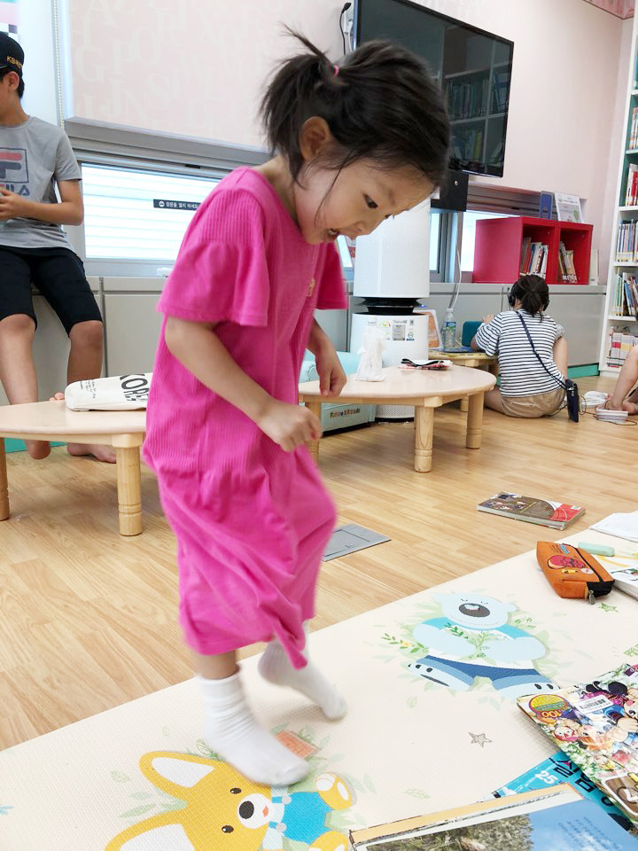 태린이는 도서관에서 책을 계속 읽을 때가 있고 놀기 바쁠 때도 있다. 중학생 언니들도 읽을까 말까 한 책을 가져와 30분 내내 읽어달라고 보채기도 한다. 어떤 책을 집중해서 보다가도 금방 자리를 뜨고 공간을 돌아다닐 때도 많다. 처음 가 본 도서관에 가면 책보다 그 공간을 즐기기 바쁘다. 보통 어린이 도서관은 재미있게 인테리어 돼있기 때문이다. 무게가 많이 나가지 않은 애라 빨리 뛰어다녀도 쿵쿵 소리가 나지 않는다. 불행 중 다행이다. 뛰어다니다가도 꽂히는 책이 있다. 엄마가 읽어주는 책도 있지만 본인이 들고 온 책을 읽고 싶다는 욕구를 강하게 드러냈다. 처음엔 엄마가 들려주고 싶은 책을 들이댔지만 마음을 가다듬고 도서관데이의 기획 의도를 흐리지 않기 위해 마음껏 고르고 읽도록 해준다. 어떤 날은 아이가 너무 흥분해서 소리를 낼 때가 있다. 다른 아이들에게 피해를 줄까봐 집에 가자고 하는데 가기 싫다고 울고 불고 하기도 한다. 도서관이 정말 친숙한 공간이 됐구나 싶다.