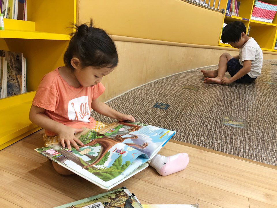 처음에는 사방팔방 뛰어다니기만 하는 태린이가 도서관에서도 그러면 어떻게 하나 걱정이 됐다. 마음대로는 되지 않을 거라고 각오했다. 우려와 달리 두 번째 방문부터는 먼저 달려가 알아서 신발을 벗고 자리를 잡고 한 권 골라 읽기 시작했다. 석 달이 지난 뒤부턴 직접 책도 빌려보았다. 아이랑 처음 찾은 양천구 영어특성화 도서관은 아이가 살짝 뛰어다니고 책을 흥분해서 읽어대도 눈치 볼 부담이 없는 장소다. 요즘 구에서 운영하는 큰 공공도서관들은 '어린이 자료실'을 한 층에 통째로 만들어 두고 한 편에 또 다른 공간을 만들어 영유아 방을 마련해둔다. 수유실이 있는 곳도 있다. 영유아 방이 아니라도 엄마가 아이에게 책을 소리내어 읽어줄 수 있는 방이 있는 도서관이 많아졌다. 심지어 주민센터에 딸린 작은 도서관에도 어린아이들을 위한 공간이 있다. 그러한 분위기가 자녀가 어린 나 같은 엄마들에게도 도서관을 다닐 수 있는 용기를 주었다.