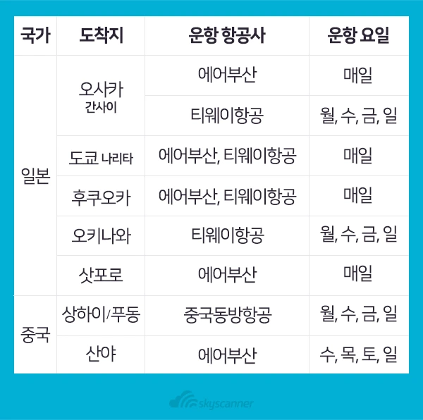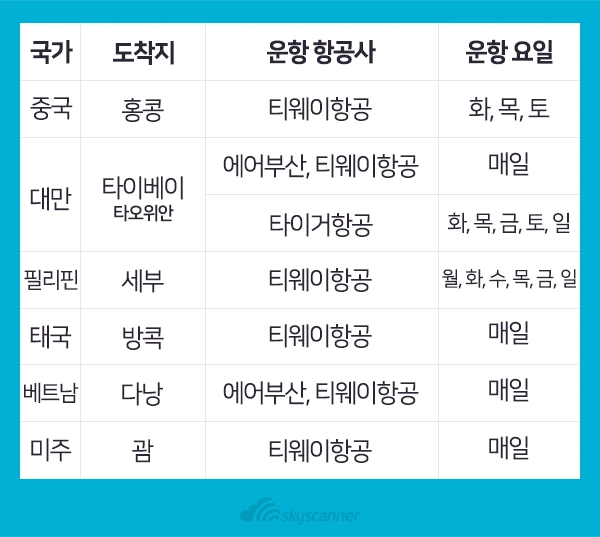 2018년 1월 16일 기준으로 국내 항공사는 티웨이항공과 에어부산에서 운항하고 있으며, 외국 항공사는 타이거항공과 중국 동방항공이 대구국제공항에서 운항하고 있다. 대구국제공항에서 다양한 노선을 운항 중이니 위의 표를 참고하여 항공권을 비교검색 해보자!