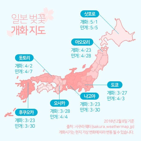 2018년 일본 벚꽃 개화 시기는 2월 8일 기준으로 상기와 같다. 다만, 기상예보에 따라 다를 수 있어 시기가 안 맞을 수 있지만, 이 시기에 일본 벚꽃 여행을 떠난다면, 분홍빛 벚꽃이 흩날리는 멋진 장관을 볼 수 있다. 다만, 인기가 많은 오사카(교토) 경우는 3월 28일경 벚꽃이 개화 되면서 4월 4일경 만개가 되니 미리 서두르는 것이 좋다.