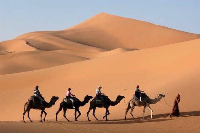모로코 여행의 하이라이트는 아마도 사하라 사막 횡단이 아닐까? 에르그 쉐비는 에르그 시가가와 함께 모로코의 대표적인 사막지대로 사구의 높이가 무려 150미터에 이른다. 붉은빛 모래가 인상적인 이곳에 서면 절로 숙연해진다. 사하라 사구로의 여행은 보통 사막 마을 메르주카(Merzouga)에서 시작되는데, 이곳을 기반으로 낙타 트레킹도 하고, 사막 한가운데에 있는 오아시스에서 숙박을 하기도 한다.