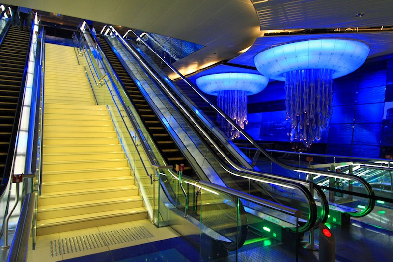 두바이의 지하철역은 현대적인 건물들로 각광받고 있는 두바이의 현주소를 보여주고 있는 듯 하다. 세계에서 가장 긴 무인 자동운전 전동차를 구축해 첨단 기술을 보여주고 있는 두바이의 지하철역은 기본에 충실하면서도 아름다운 디자인으로 사람들의 마음을 빼앗는다. 곡선형태의 루드 디자인으로 정거장을 덮으면서 조그만 창문들을 통해 빛이 들어온다. 가장 눈에 띄는 역은 Khalid al Waleed 역으로 해파리의 모양을 한 샹들리에와 물, 공기, 흙, 불 등의 자연요소를 활용한 인테리어 디자인이 아름답다.